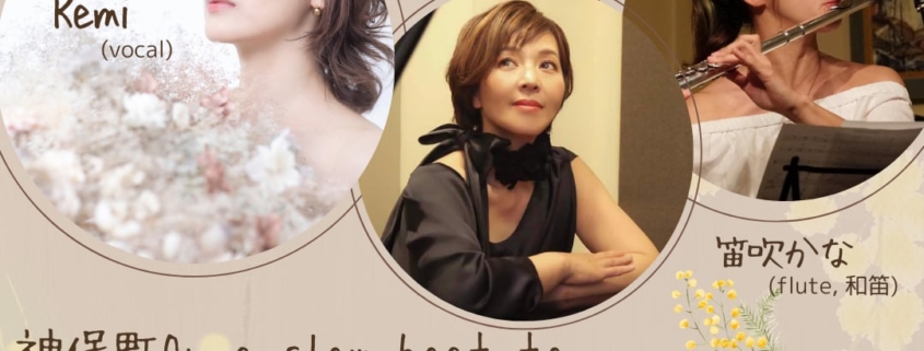 今回は、いつも女子心をくすぐるトーク(&小芝居)と胸に響くヴォーカルで楽しませてくれるREMIさんに加え、フルート、和笛の笛吹かなさん、世界的にも珍しいクラビオーラ(木管鍵盤ハーモニカ)/エレピの折重由美子さんとニューメンバーでお送りします。